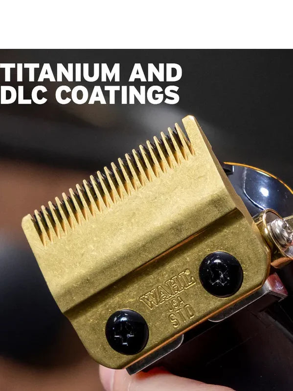 2161-700 Stagger-Tooth Clipper Blade Gold, engineered for the Gold Cordless Magic Clip. This precision-crafted blade features staggered teeth, ideal for achieving seamless blends and fast, on-scalp cutting. The Wahl Stagger-Tooth Blade's innovative crunch blade technology gives barbers audible feedback, ensuring precise cuts every time. Made from high-carbon steel with titanium and DLC coatings, this blade is designed to last, offering superior durability, corrosion resistance, and cooler blade performance. For professional-grade results, the Wahl 2161-700 Stagger-Tooth Clipper Blade is a must-have tool.